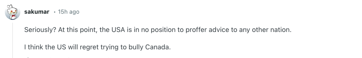“真的吗?在这点上,美国根本没有资格对其他国家指手画脚。我认为美国会后悔试图霸凌加拿大。”↓