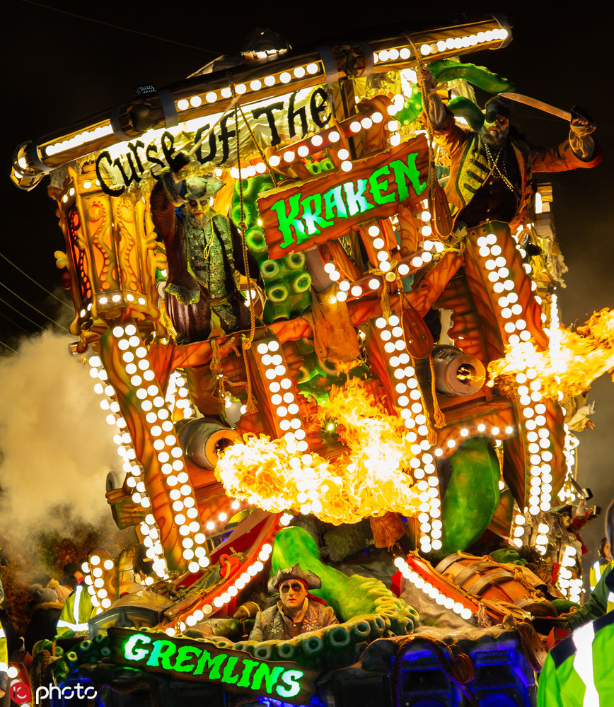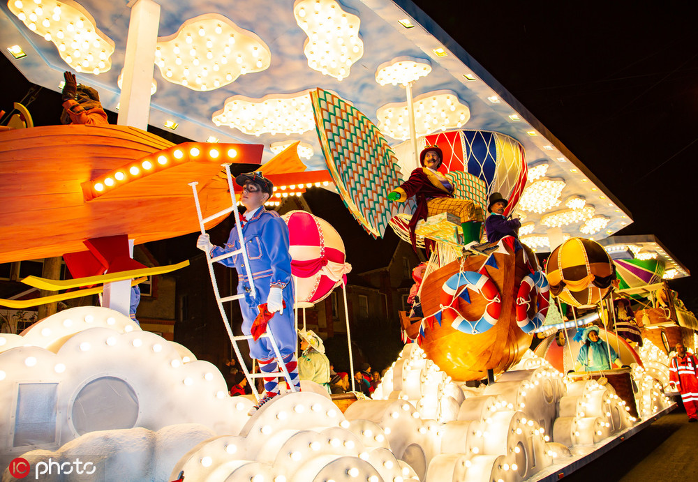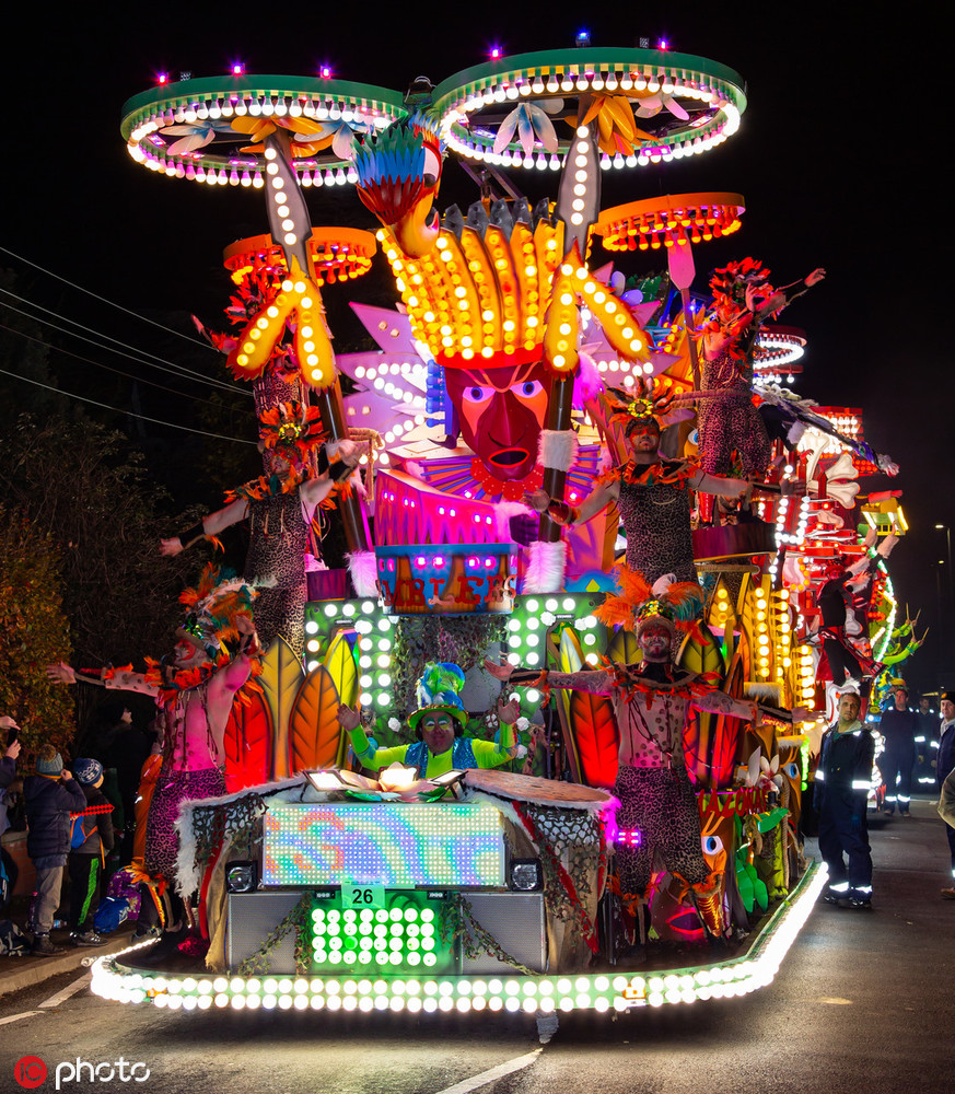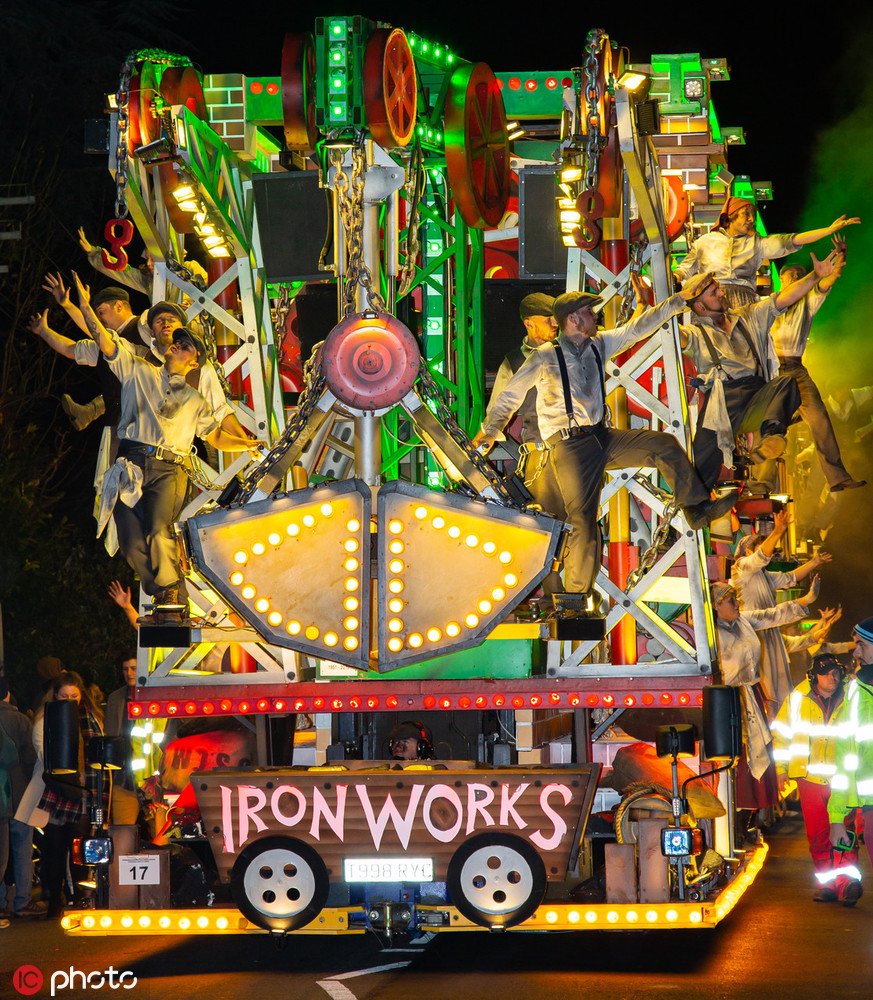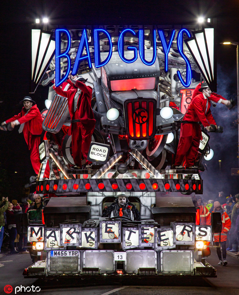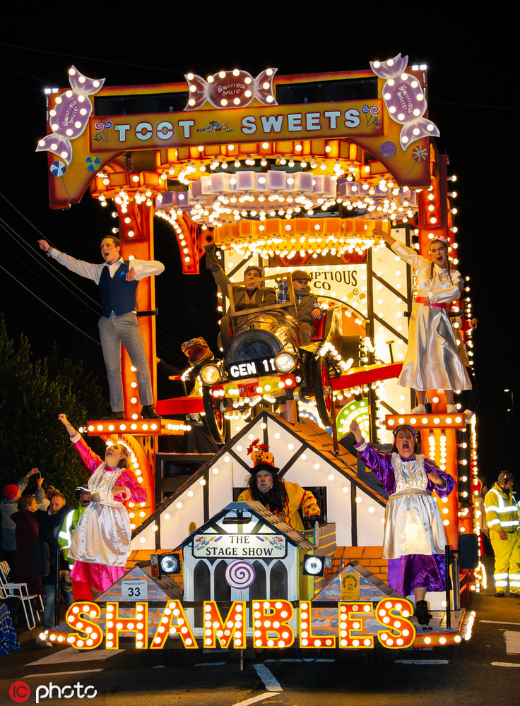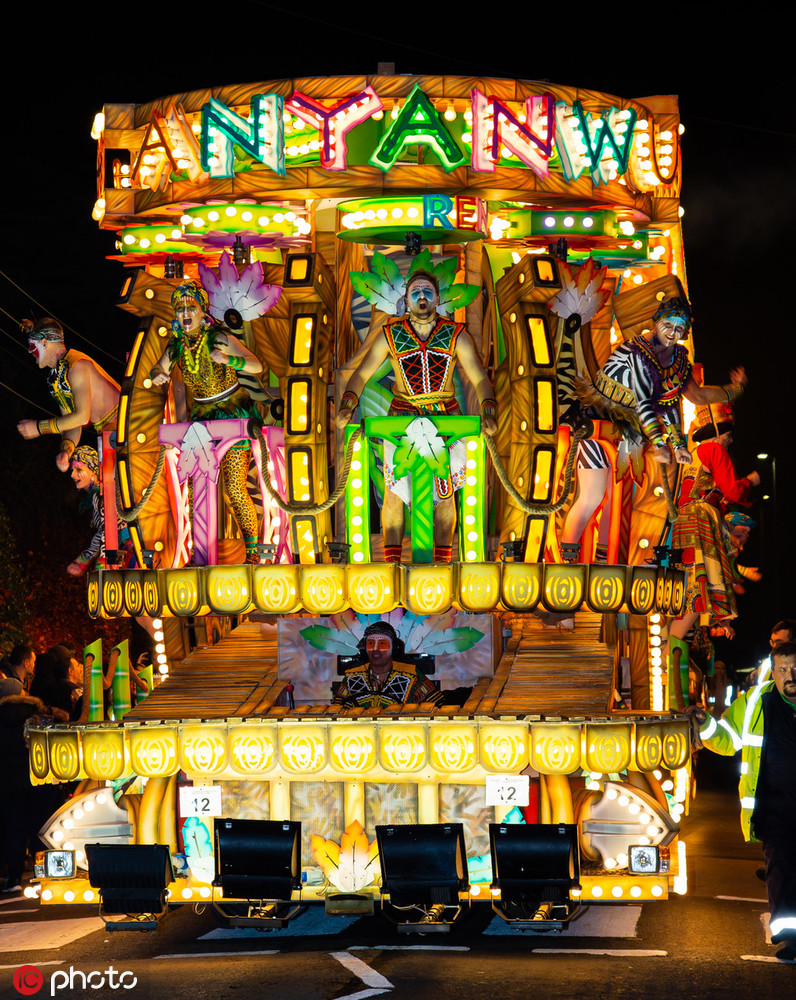 【环球网文化频道综合】当地时间2019年11月16日,英国萨默塞特郡格拉斯顿伯里,2019年格拉斯顿伯里嘉年华巡游举行,五彩缤纷造型浮夸的花车照亮寒冷的夜晚。(图源:东方IC)