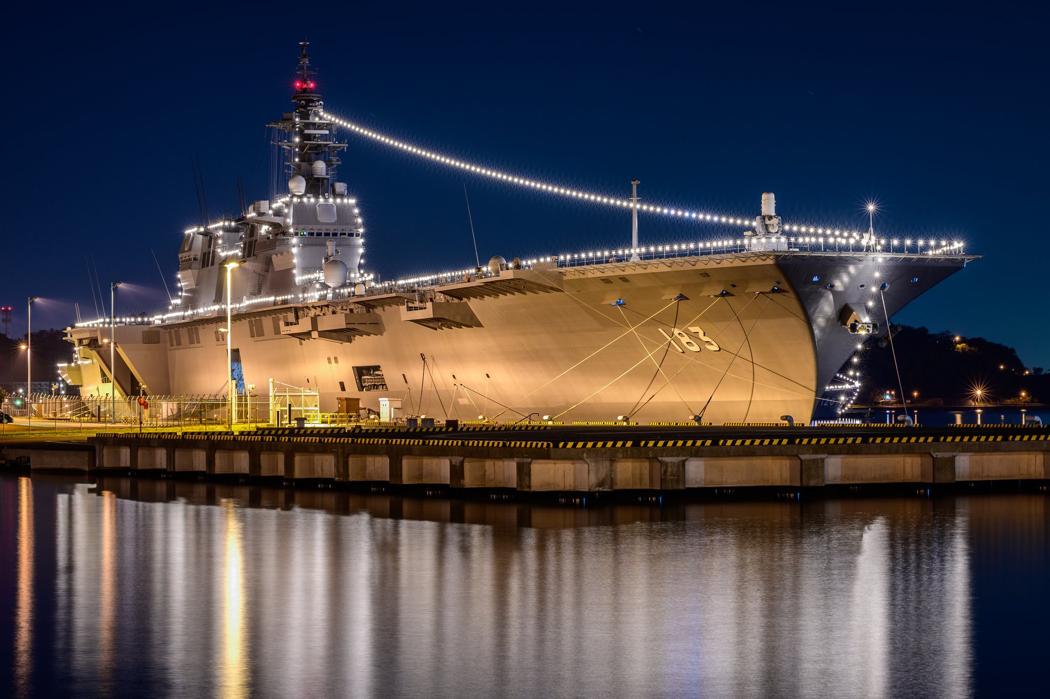 日准航母驱逐舰聚集港口打开彩灯相当炫目