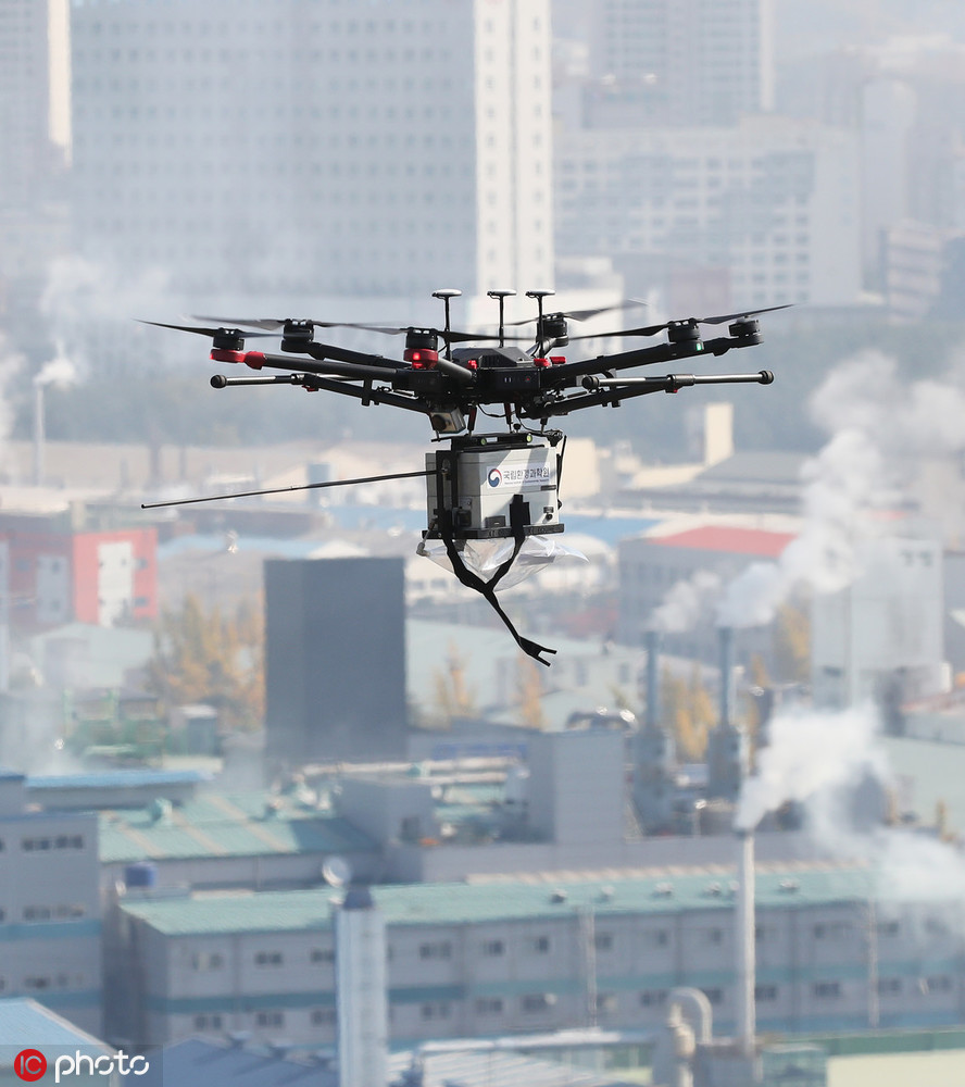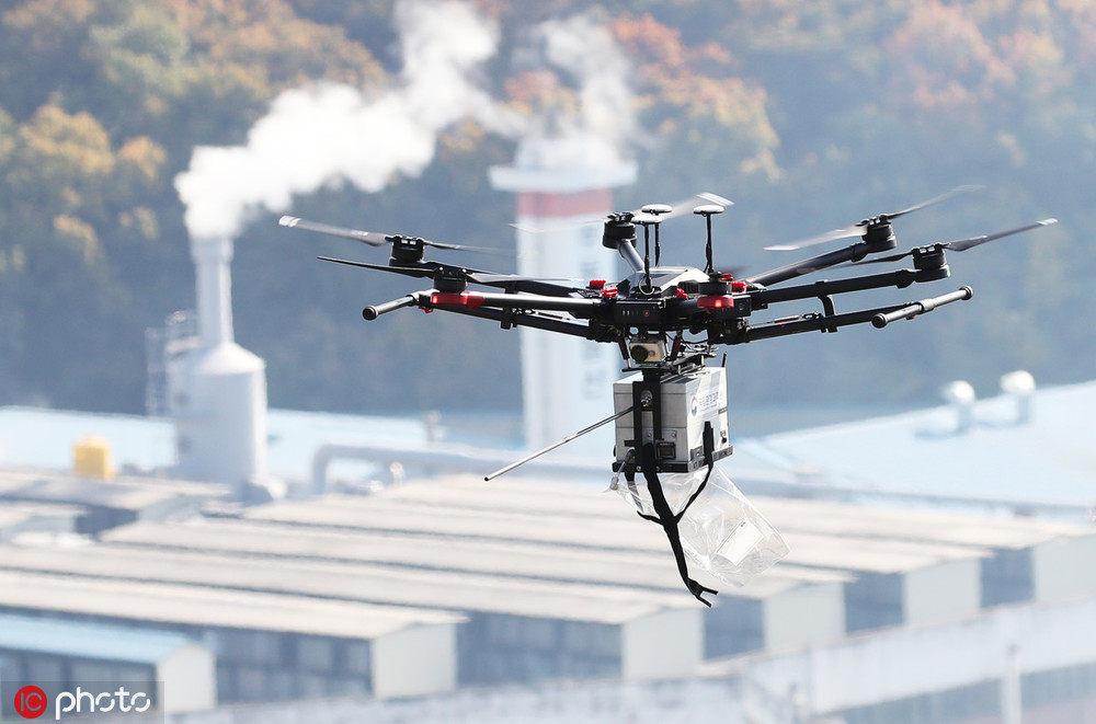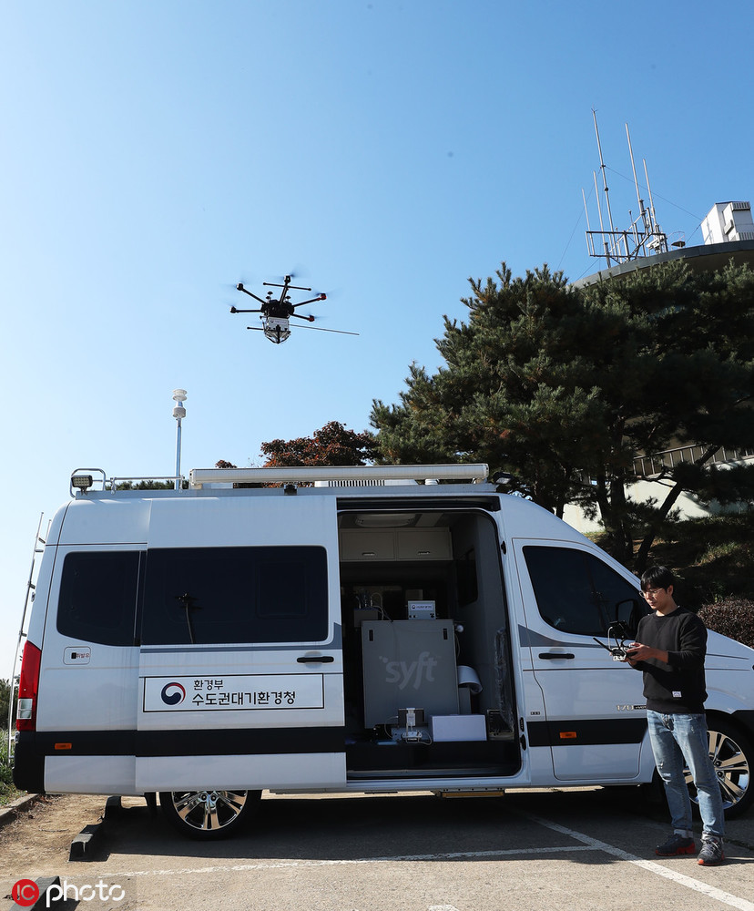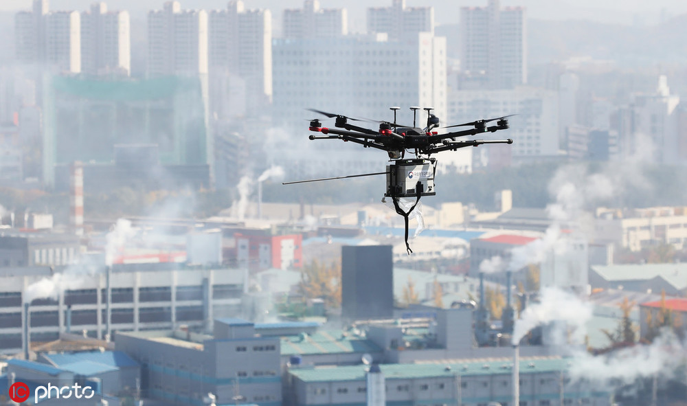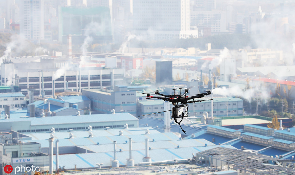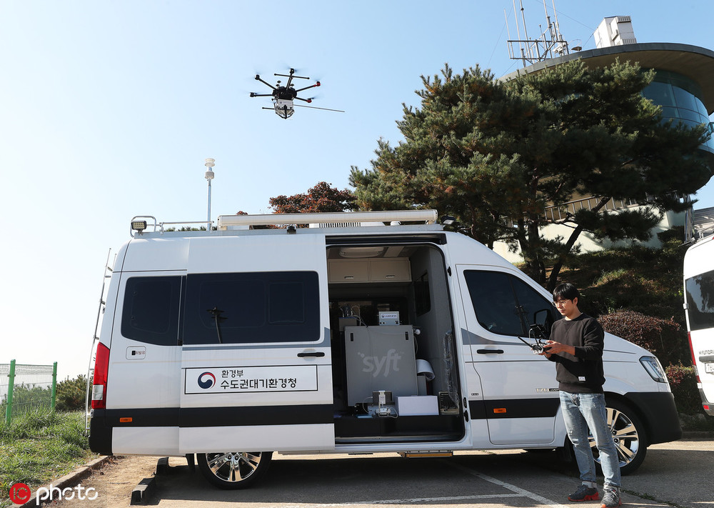 当地时间2019年11月10日,韩国京畿道安山市,韩国环境部首都圈大气微尘监视组出动无人机,测定空气污染指数。(图源自IC图库)
