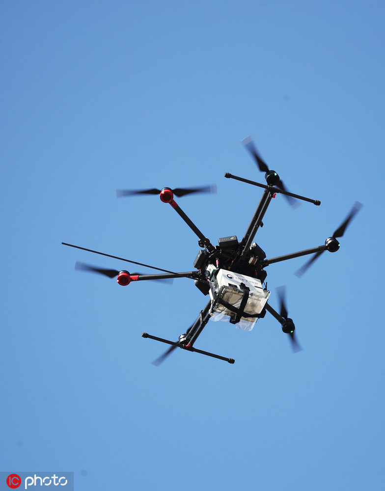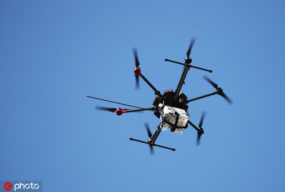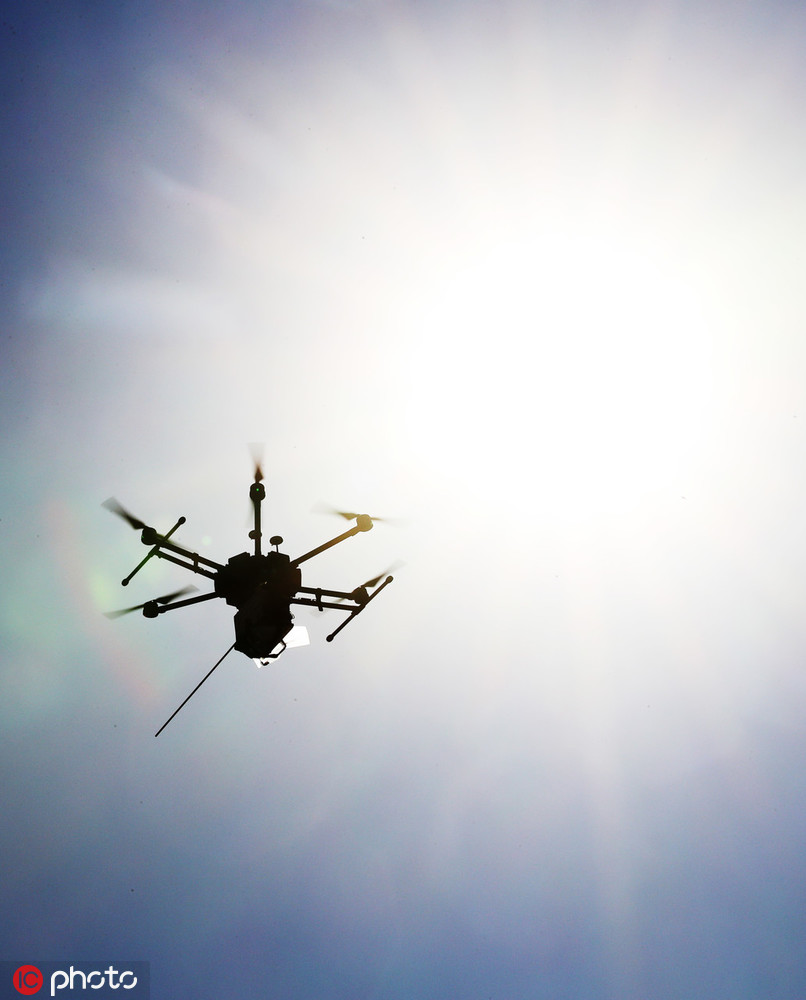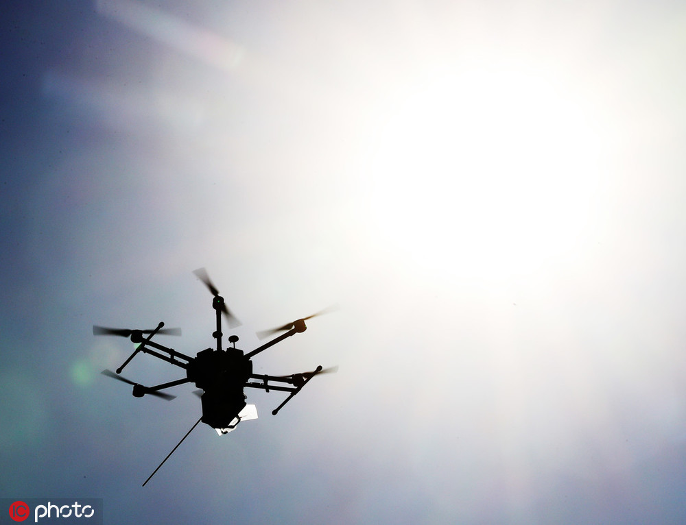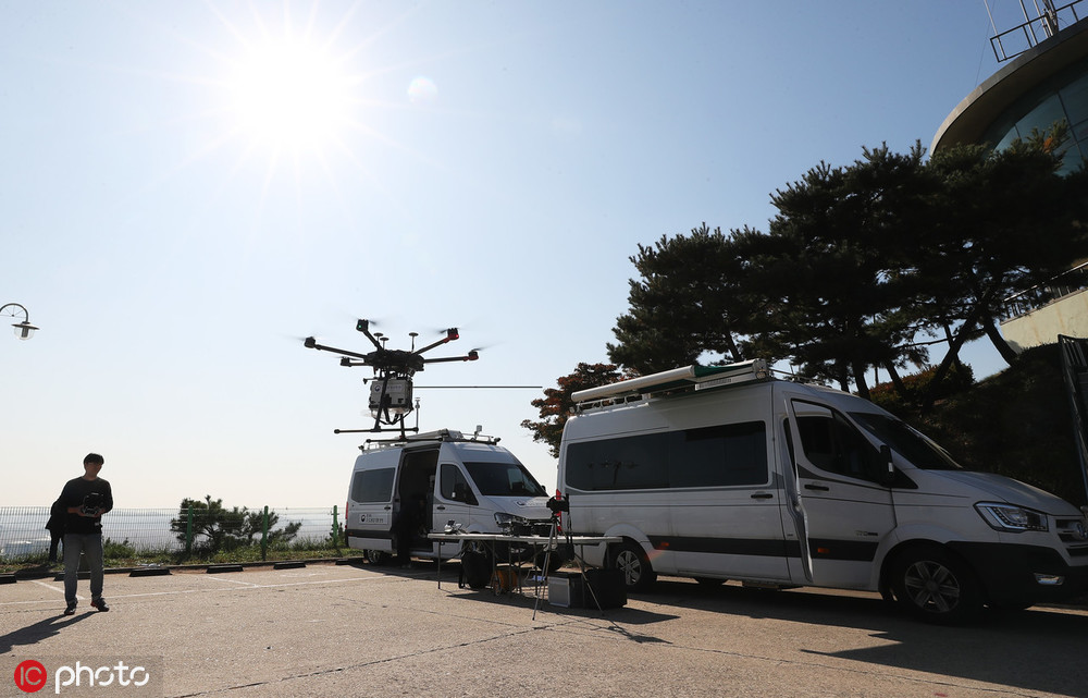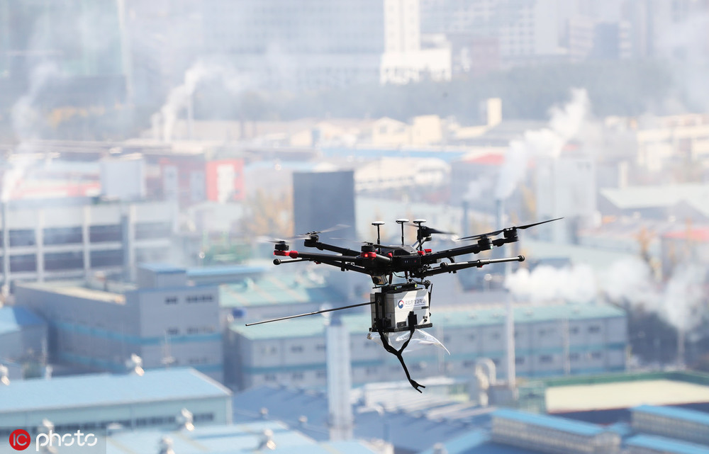 当地时间2019年11月10日,韩国京畿道安山市,韩国环境部首都圈大气微尘监视组出动无人机,测定空气污染指数。(图源自IC图库)