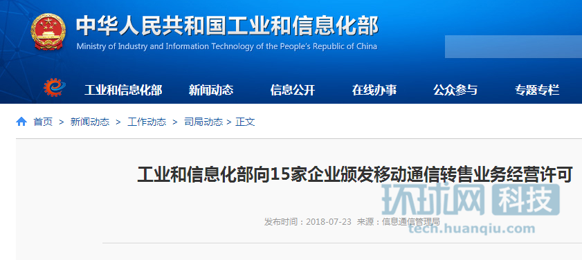 【环球网科技 记者 林迪】7月23日,记者从工信部官网了解到,为鼓励移动通信业务创新,提升移动通信整体服务水平,工业和信息化部依照法定程序,严格审核,于近日向与中国联合网络通信集团有限公司首批签约的15家企业(详见附件)发放了经营许可证,批准其经营移动通信转售业务。
