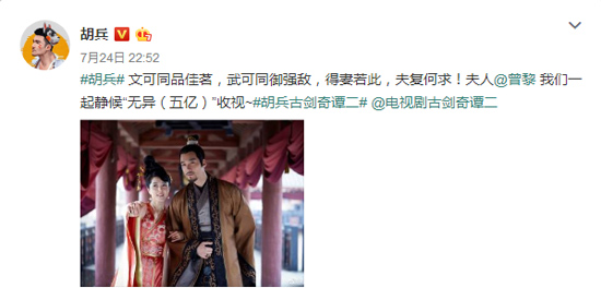 “文可同品佳茗,武可同御强敌,得妻若此,夫复何求!夫人@曾黎 我们一起静候“无异(五亿)”收视~ ”。7月24日晚间,《古剑奇谭2》播放量冲击五亿之际,演员胡兵微博隔空喊话“夫人曾黎”静候收视,还用剧中儿子乐无异的名字大玩谐音梗逗趣“爱妻”,并顺势贴出二人挽臂同行的剧照作为配图,令网友列队齐喊“猝不及防吃了一嘴狗粮”。