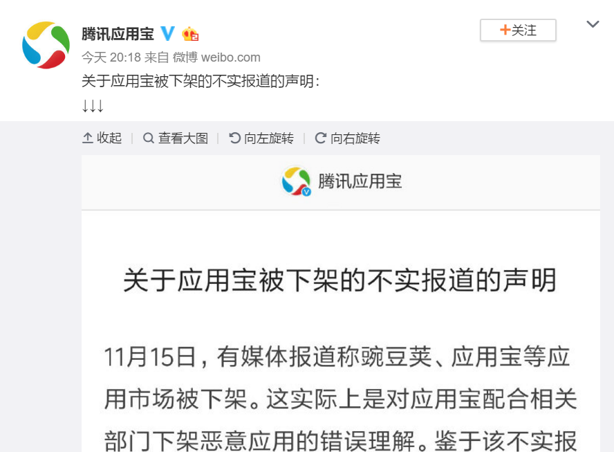 随后,腾讯应用宝也在官方微博发表声明称:这是对应用宝配合相关部门下架恶意应用的错误理解。