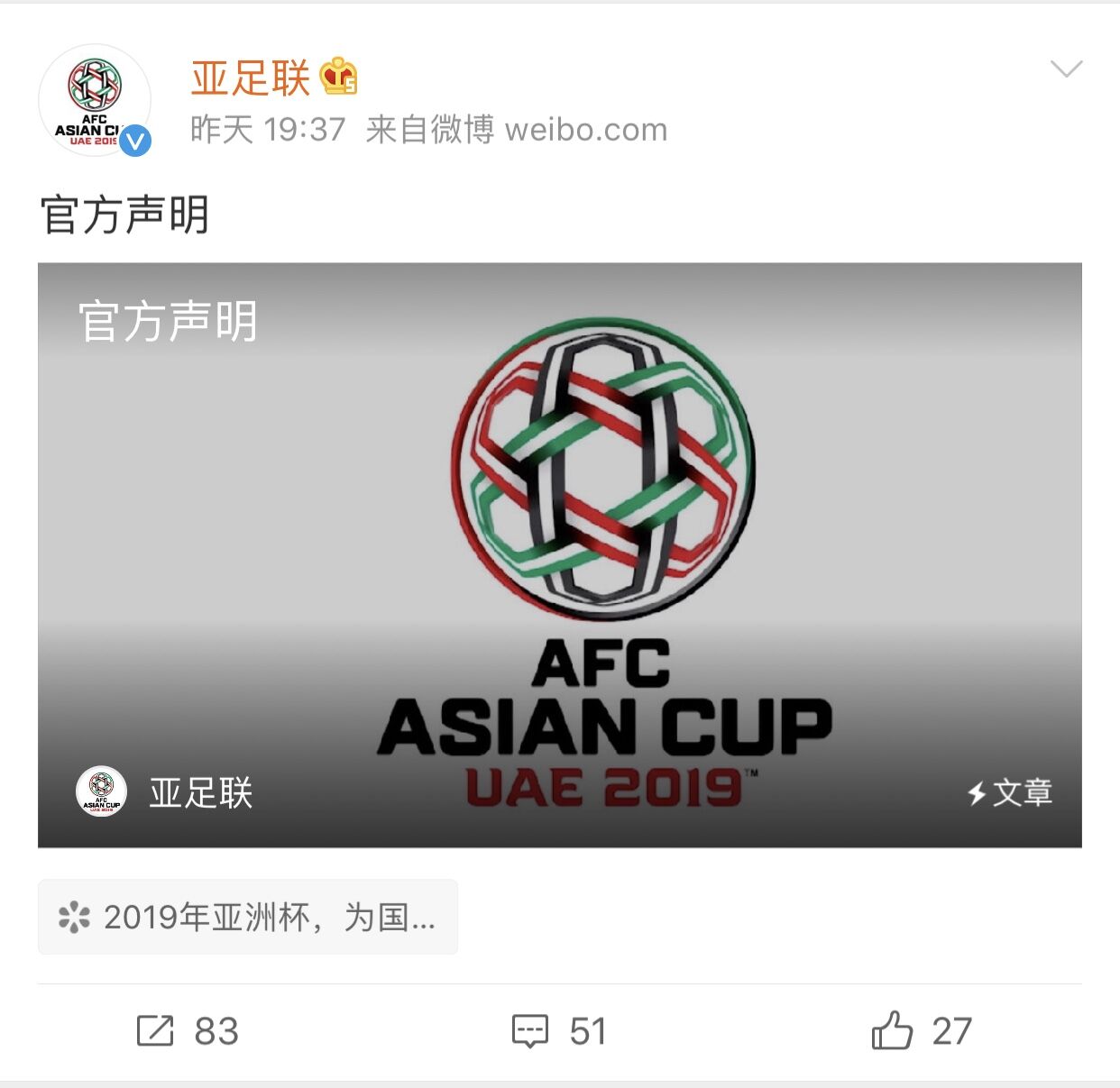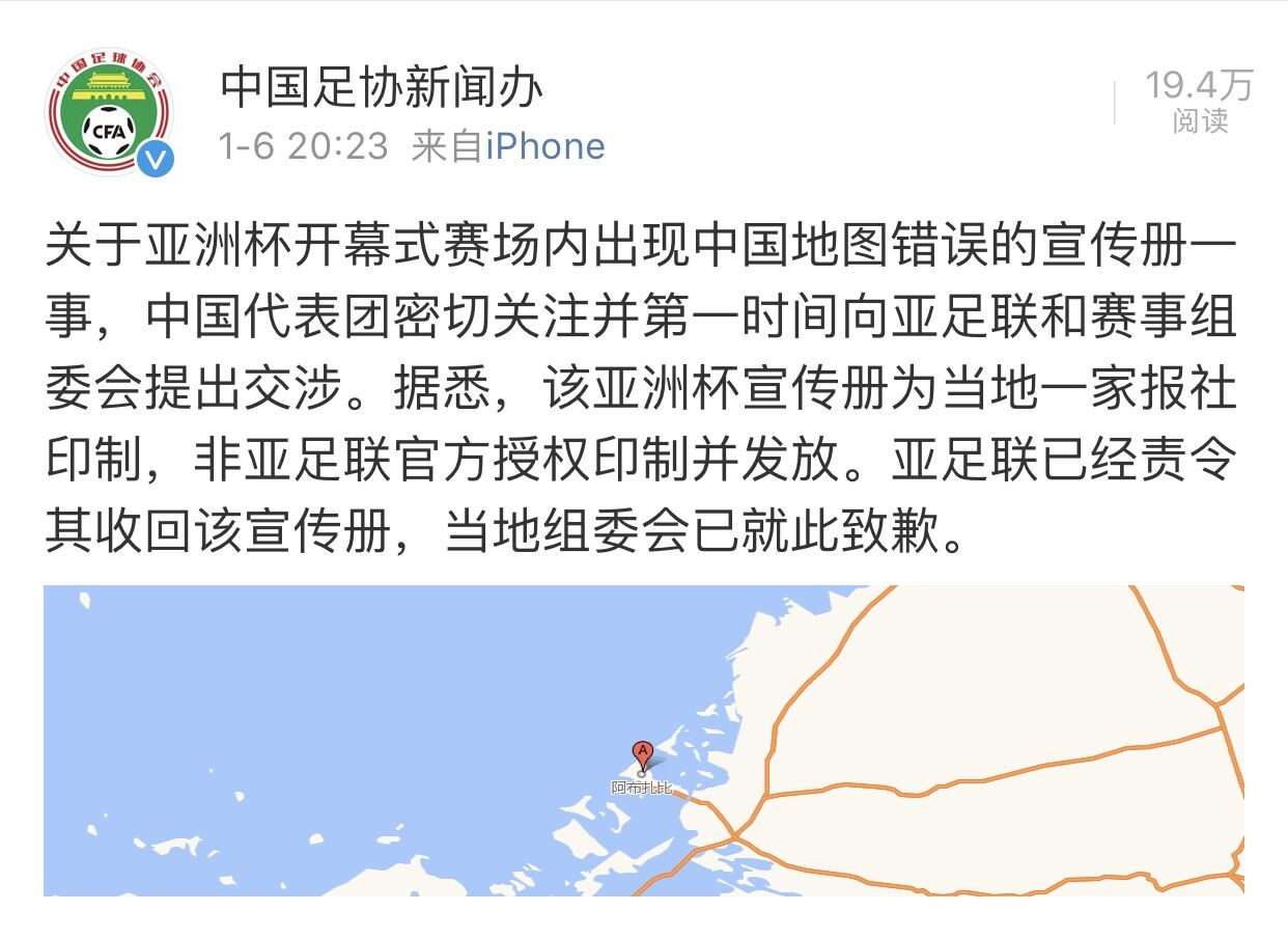 随后,中国足协新闻办也在其官微发表声明,称关于亚洲杯开幕式赛场内出现中国地图错误的宣传册一事,中国代表团密切关注并第一时间向亚足联和赛事组委会提出交涉。据悉,该亚洲杯宣传册为当地一家报社印制,非亚足联官方授权印制并发放。亚足联已经责令其收回该宣传册,当地组委会已就此致歉。