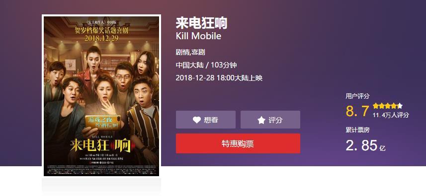 乘着年度600亿的歌声,我们也在2018年的年尾感受到太多的意外,改编自《完美陌生人》的电影《来电狂响》本来在这个档期是不被看好的,但凭借着质量和口碑硬是顶上来了,最终豆瓣评分6.1分,猫眼评分8.7分,淘票票评分8.5分,堪称“2018年末最大的惊喜”;