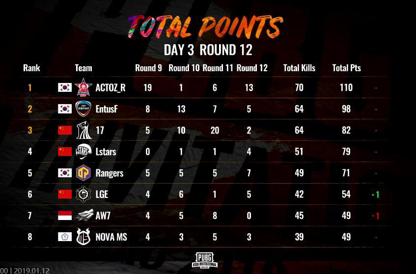 2019绝地求生亚洲邀请赛(PAI)于1月12日在中国澳门金光综艺馆圆满收官,韩国Actoz(亚拓士)战队在三天的比赛中,五场吃鸡,力夺邀请赛总冠军,并获得25万美金奖金!