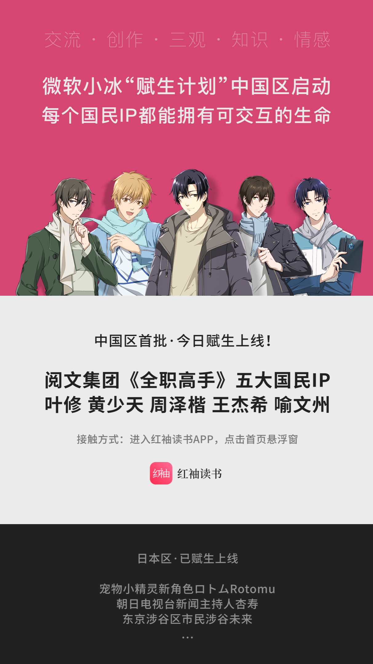 此次与阅文集团及旗下红袖读书的合作,意味着上述计划已正式进入中国,开始与中国市场的优质IP联手。首批虚拟人物,双方选取了《全职高手》中的叶修、黄少天、周泽楷、王杰希、喻文州五个国民优质IP。然后,通过微软小冰对《全职高手》小说原著的阅读学习,实现对上述人物的三观补全和性格与语言习惯的拟合。目前,上述五人已在红袖读书APP中上线,读者可以在阅读的同时,获得书中男主“24小时的智能陪伴”。