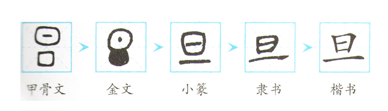 说起这个“旦”字,很多人会说:这个字很简单!不就是太阳从地面升起的样子吗?其实,甲骨文和金文中的“旦”字,下方并不是一条地平线,而是“口”字,就好像太阳刚刚跳出水面,日水相连的样子。“旦”的小篆体与现代汉字的书写方式相似,许慎在《说文解字》中形容“旦”字,“旦,明也。从日见一上。一,地也”,释义为“日出或清晨”。