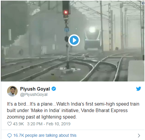 印度第一列国产准高速列车Vande Bharat Express日前进行了测试,印度铁路部长戈亚尔(Piyush Goyal)2月10日在推特和脸书上分享了列车行驶的视频,并自豪地说: