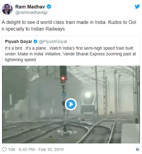 莫迪领导的印度人民党总书记拉姆马达夫(Ram Madhav)随后转发了戈亚尔的推特,并称,“很高兴看到(这列)世界级火车是印度制造”。