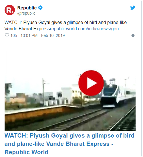 印度“共和国电视”(Republic TV )也报道了这个值得纪念的事情,“戈亚尔让我们一睹如飞鸟和飞机般的Vande Bharat Express”。