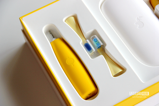 首先,我们先来看看此产品的外观。打开包装,包装内包括了牙刷手柄,超软刷头,标准刷头,便携牙刷盒,充电底座与充电线。