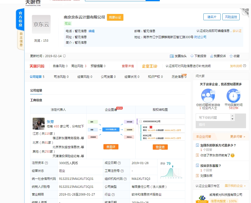 刘强东新增一家云计算公司 法定代表人为其女助理