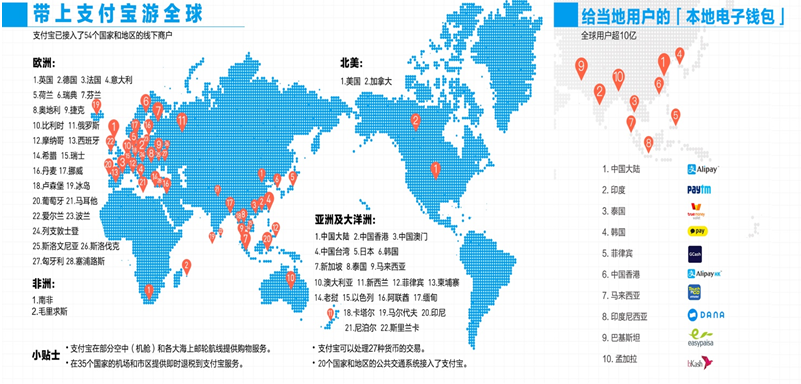 最新数据显示,迈入10亿用户时代的支付宝,已覆盖全球54个国家和地区。目前,中国游客不仅能在这些国家和地区用支付宝消费,还能在全球在35个国家和85个机场用支付宝退税,大大节约排队时间。