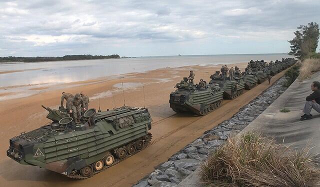 【环球网综合报道】据日本《FRIDAY Digital》新闻网2月19日报道,美军水陆两用车在边野古附近的海滨排队行进,周围笼罩着排气的浓烈气味。多辆水陆两用车冒着黑烟从海上行驶靠近海边。沉重回响的引擎声和排放废气所散发的臭味,正逐渐浓烈。排成整齐队伍的车辆在沙滩上登陆后,出现了100人左右身着迷彩服的强壮士兵。