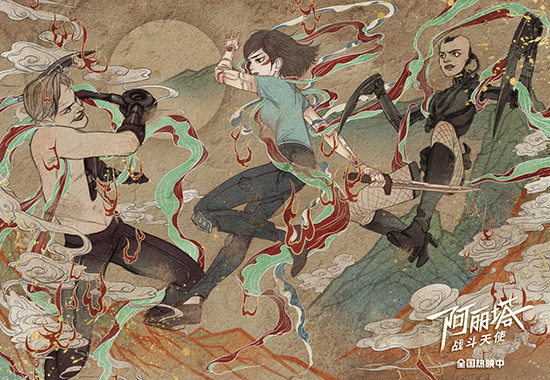 片方最新发布的这组海报以中国风呈现了影片中最精彩的四场动作戏。第一幅海报中阿丽塔初试身手、不畏凶险勇斗恶徒;第二幅海报中阿丽塔纵身而起,机动球赛场以一敌众;第三幅海报中阿丽塔独闯险境、手持利刃力劈华山;第四幅海报中阿丽塔闪转腾挪,面对邪恶绝不姑息。四幅海报的中国风画面让人产生亲切感,又与人物未来感十足的设定形成有趣的对比。细腻笔触下的阿丽塔形神俱备、英气十足,流畅的线条勾勒出她舒展矫捷的身形,影片中阿丽塔克敌制胜的绝招也在海报画面中完美再现,再加上画面上的流云、飞火、长绫,一个中国版“战斗天使”跃然纸上。