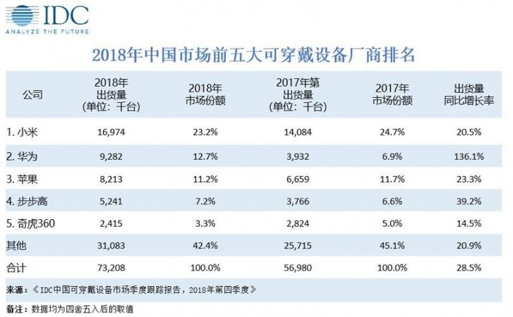在2018年第四季度中,小米的市场份额为23.5%,领跑中国市场;华为的出货增长速度最快,同比增长率达206.1%,三个月内出货438.8万件,超越第四季度市场份额占比10.1%、全年占比11%的苹果公司。