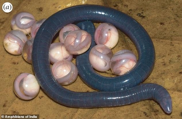 图片显示,这些小透明球包裹着Chikilidae(一种无腿两牺动物,中文名尚未确定)家族的生物,这种生物与蝾螈有关。Chikilidae是无足目动物,三种两栖动物群中最原始的动物。