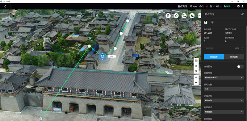 在地图上设定一系列航点即可自动生成航线,支持为每个航点单独设置丰富的航点动作,同时可调整航点的飞行高度、飞行速度、飞行航向、云台俯仰角度等参数。对于精细化飞行任务,还可在已建好的二维正射地图或三维模型上进行航点规划,规划效果更直观。