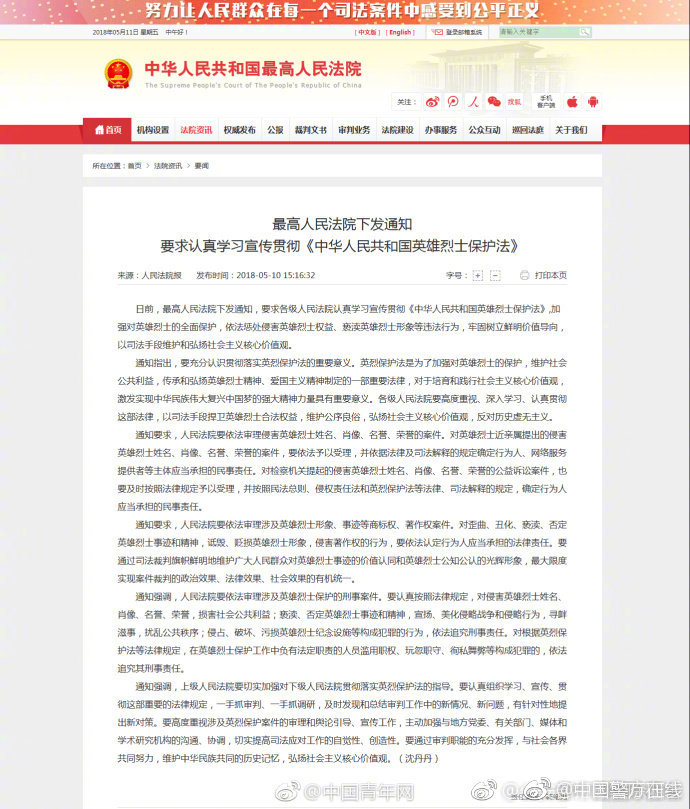 在微博中,@中国警方在线 还特意贴出最高人民法院下发的有关要求认真学习宣传贯彻《中华人民共和国英雄烈士保护法》的通知。↓