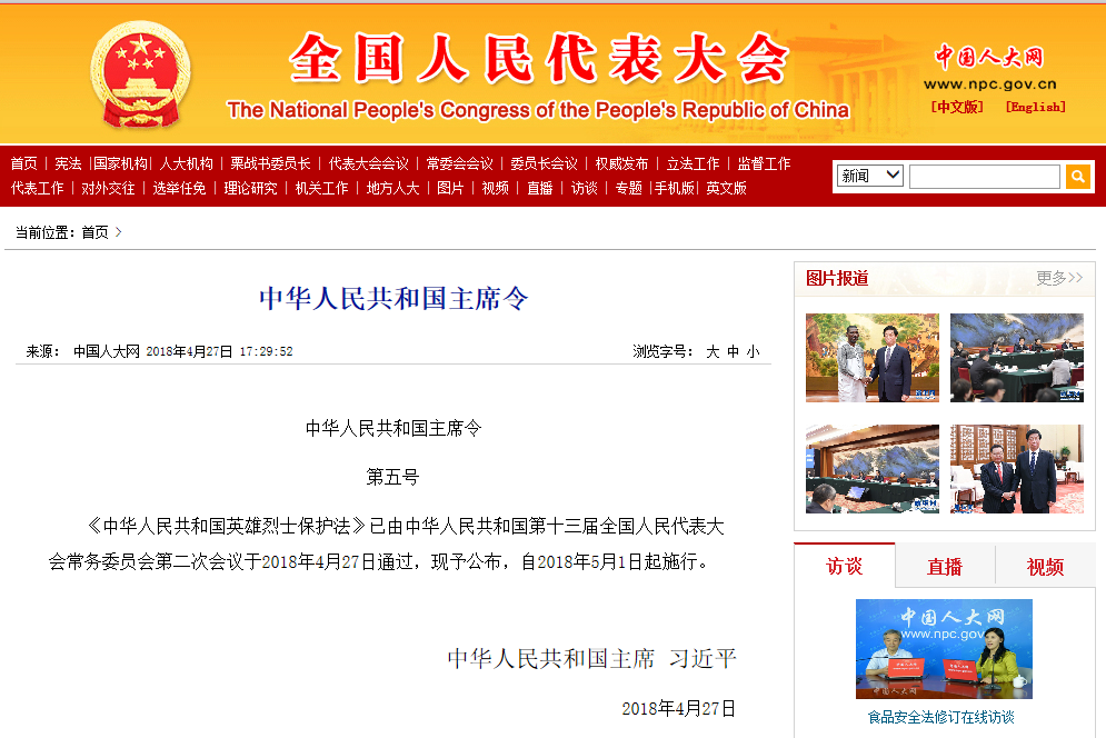 根据此前媒体报道,2018年4月27日,十三届全国人大常委会第二次会议全票表决通过《中华人民共和国英雄烈士保护法》,以立法形式对英雄烈士进行保护。该法共三十条,对近些年出现的涉及英雄烈士的热点事件,进行了立法回应。