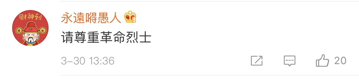 在微博上,网友呼吁道“尊重革命烈士”、“烈士不容戏谑”、“英烈应该尊重缅怀”。↓