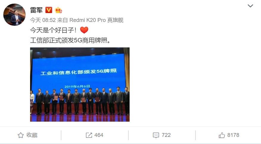 雷军道贺工信部发放5G商用牌照 小米成为全球首批商用5G手机厂商之一