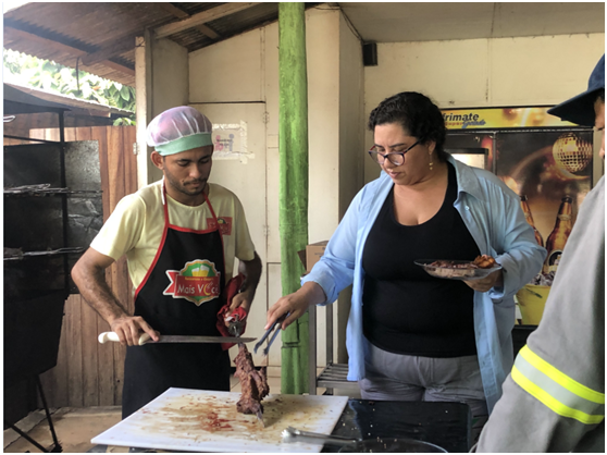 “是的,开始这里的烤肉也和里约热内卢差不多,但是烤肉师傅发现做得越咸越受欢迎,于是就开始多放盐。我们的工程师,中国的和巴西的,在这里工作都会出很多汗,他们需要盐份。“