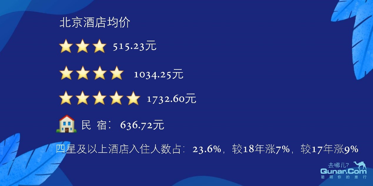 价格方面,今年暑假北京酒店市场全面涨价,经济型酒店(三星及以下)、高档型酒店(四星级)、豪华型酒店(五星级)相较去年同期分别增长7.4%、10.1%、7.7%,其中高档型酒店全市平均价1034.25元,首次实现“破千”。尽管价格一路走高,但是今年暑期四星及以上酒店入住人数占总量的23.6%,较18年涨7%。此外,受2019北京世界园艺博览会影响,延庆地区民宿相较2018年平均价格上涨41%。