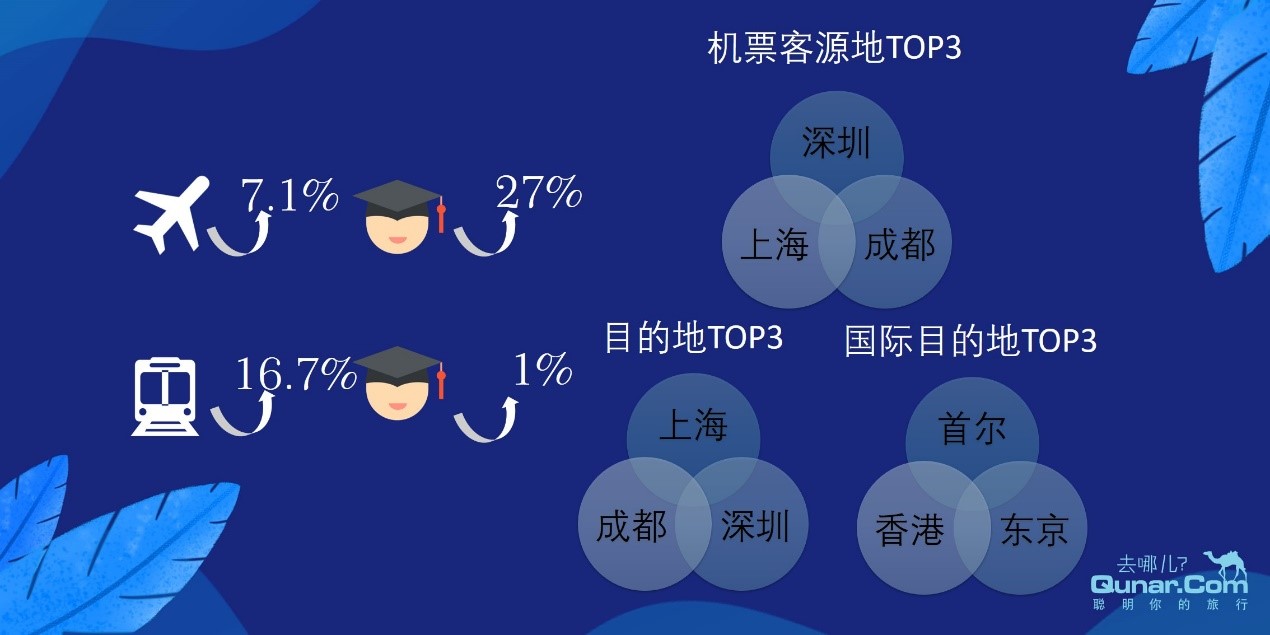 但截然不同的是,机票市场在“机票学生价”等相关低价政策的影响下,学生群体较去年同期增长27%,是增幅最快的用户群体。尽管高铁提速、线路网路日趋密集,又适逢中小学暑假,但今年火车票却与去年同期基本持平。