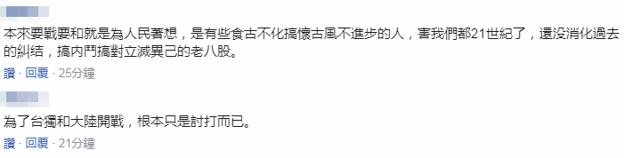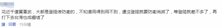 还有人分析称,台当局花近千亿买的军武,大都是登陆后防卫的,“不知道用得到用不到,还没登陆就要防卫消灭了,等登陆就差不多了,再打下去台湾也成废墟了。”“为了台独和大陆开战,根本只是讨打而已。”