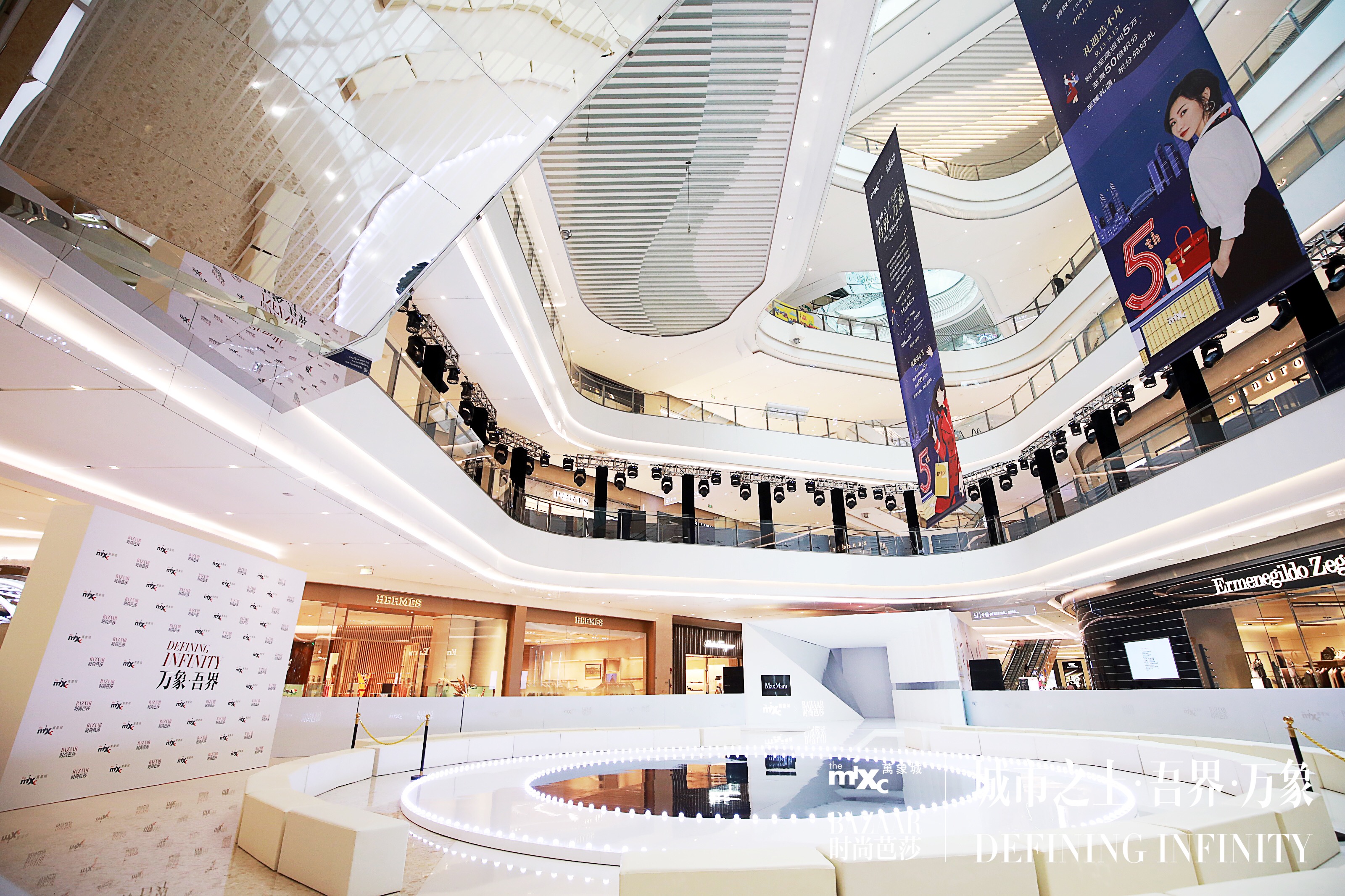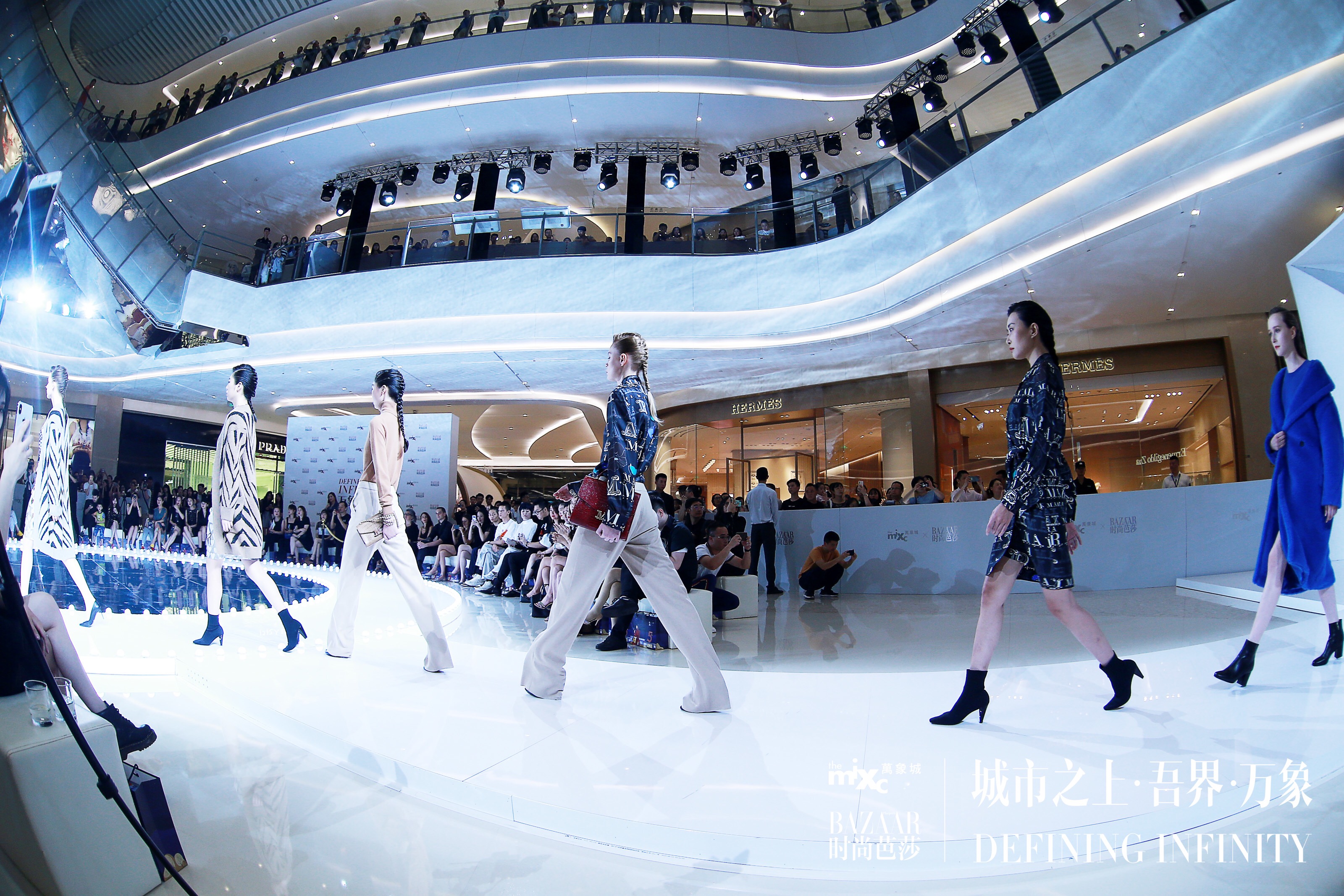 整个秀场以“我的世界,就是中心”为创意灵感,以纯粹高雅的白色系为主色调,以镜面元素映射“无界”,将目光中心聚焦于秀场,360度开阔呈现,兼具开放与聚合之意,彰显万象城大气包容之感。