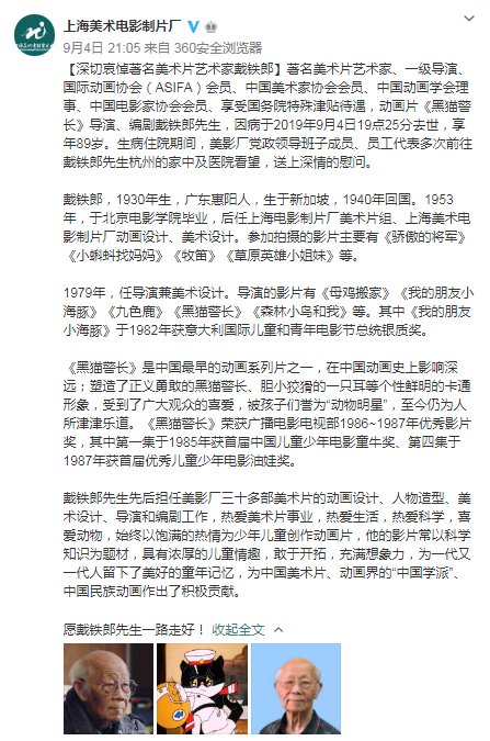 《黑猫警长》导演戴铁郎逝世 为一代人留下童年记忆