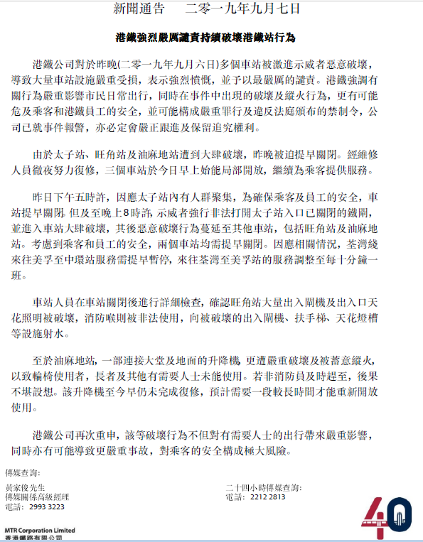 港铁公司9月7日发布新闻通告,并介绍港铁站被破坏及随后修复的情况。港铁提到,由于太子站、旺角站及油麻地站遭到大肆破坏,6日晚间被迫提早关闭。经维修人员彻夜努力复修,三个车站于7日早上局部开放,继续为乘客提供服务。