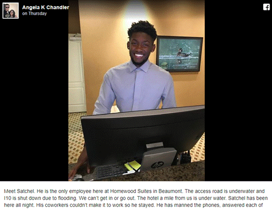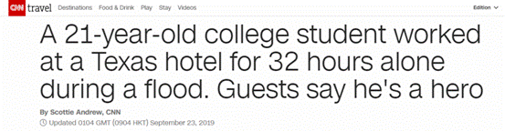 【环球网报道 见习记者 朱海逸】美国德克萨斯州一名21岁大学生在洪水中坚守岗位32小时,身兼多职把酒店里的客人安排得妥妥当当,客人们不禁赞叹:他是个英雄!