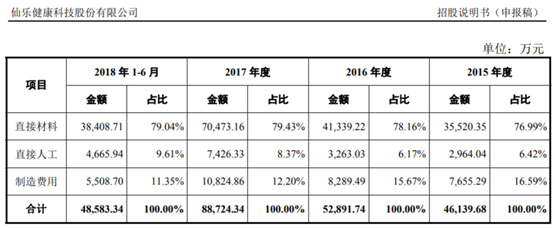 再来看仙乐健康的财务数据,根据招股书披露的成本构成信息,仙乐健康的直接材料成本占比高达近80%;而与此同时,招股书披露的主要原材料占生产成本比重信息中,披露的5项核心原材料成本占比合计仅为27%左右,这也就意味着在仙乐健康的直接材料成本当中,有占比达50%以上的部分,并非是由核心原材料构成。但是针对这部分占比巨大的直接材料项目,仙乐健康在招股书中并未作出详细披露。