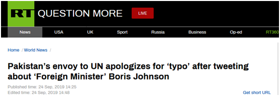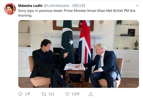 【环球网报道 记者 王博雅琪】第74届联合国大会一般性辩论24日在纽约联合国总部拉开帷幕。“今日俄罗斯”(RT)当天爆出了此次联大会议期间发生的一个小插曲:在巴基斯坦总理伊姆兰•汗与英国新任首相鲍里斯•约翰逊23日会面后,巴基斯坦常驻联合国代表马莉哈•洛迪在当天发布的一条推文中竟错把约翰逊称作了“英国外交大臣”。