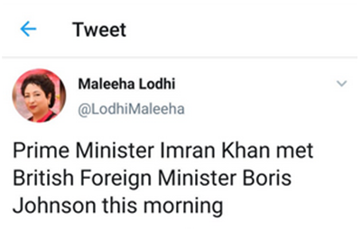 RT说,洛迪在这条推文中写道,“伊姆兰•汗总理今天上午会见了英国外交大臣鲍里斯•约翰逊。”而早在今年7月23日,英国保守党党内投票结果公布,前任英国外交大臣的约翰逊以压倒性优势击败竞争对手——时任英国外交大臣的杰里米•亨特,当选保守党党魁,随后入主唐宁街10号,出任英国首相。