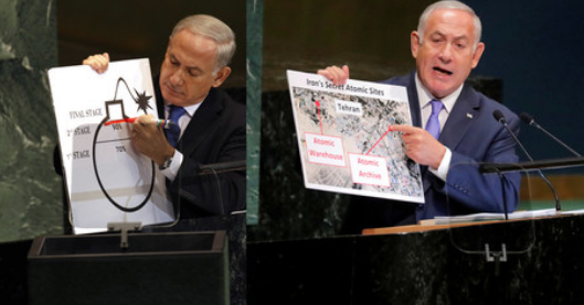 (此前,内塔尼亚胡一边拿着图纸,一边演讲。图自路透社)