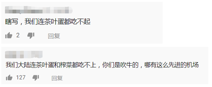 面对这样的节目画风,有大陆网友反讽表示,“我们连茶叶蛋和榨菜都吃不上,哪有这么先进的机场”↓
