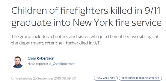 据英国天空新闻台(sky news)25日报道,纽约市消防局局长丹尼尔•尼格罗在结业典礼上说:“他们中的一些人父亲在‘9.11’袭击发生时遇难,另外有几人的父亲死于(这场恐袭遗留的相关)疾病,还有一些人的父亲在履行职责时牺牲,勇敢地拯救和保护了他人。”