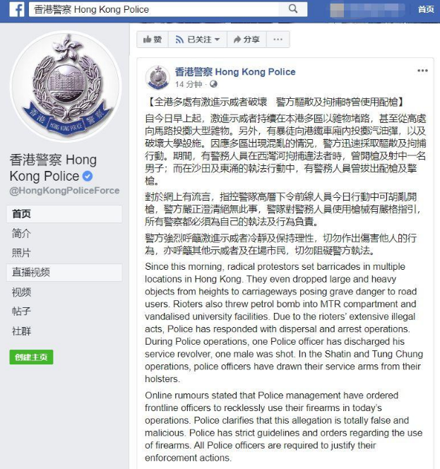 中午12时许,香港警队通过官方“脸书”账号通报情况,称全香港多地遭示威者破坏,警方行动中,有警员开枪射中违法者。此外,针对网上传播“警队高层下令前线人员行动中可胡乱开枪”的谣言,警队严正澄清绝无此事。