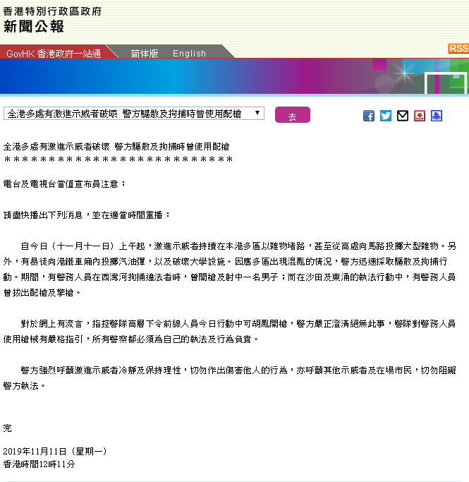 在11日中午,香港特区政府发布新闻公报,提及有警务人员在西湾河拘捕违法者时,曾开枪及射中一名男子。“警方强烈呼吁激进示威者冷静及保持理性,切勿作出伤害他人的行为,亦呼吁其他示威者及在场市民,切勿阻碍警方执法。”