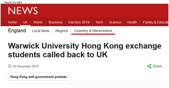 据英国广播公司(BBC)14日报道,英国华威大学的一份学生报刊“The Boar”近日称,该校“强烈敦促”(strongly urged)其在香港学习的交换生回国。根据“The Boar”的说法,华威大学校方在发给学生的一封电子邮件中说,校方一直在“密切关注香港的形势发展”,“并已做出决定……(形势)已不再适合我们的学生继续留下。”