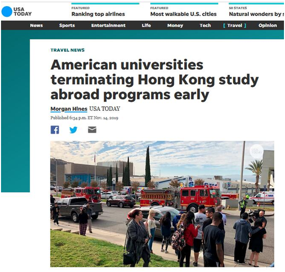 《今日美国报》14日题为“美国大学提前终止在港留学计划”的报道就提到,美国乔治城大学由学生主办的报纸《The Hoya》当地时间14日在推特上宣布,鉴于香港高校的示威活动,本学期正在香港学习的学生将返回美国。