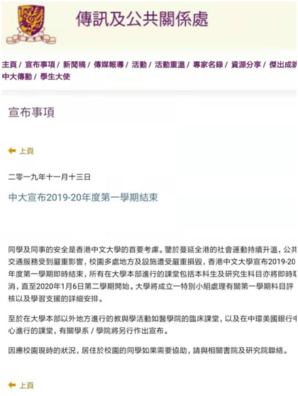受到持续严重暴力事件影响,13日,香港中文大学紧急在官网发表声明,宣布这个学期“即时结束”,所有大学部以及研究生的课程也取消。此外,香港科技大学、香港浸会大学等也决定取消本学期余下课时。