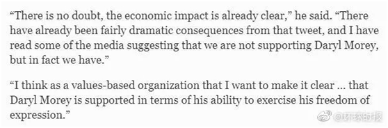肖华承认,莫雷的推特已造成经济后果。“毫无疑问,经济上的影响已经十分明显”,他说,“那条推特已经产生了相当巨大的后果,我也读到一些媒体的报道,暗示我们不支持莫雷,但事实上,我们支持(莫雷)。”