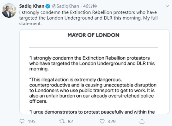 对于该组织这次行动,伦敦市市长萨迪克·汗推特发文表示“强烈谴责”。↓