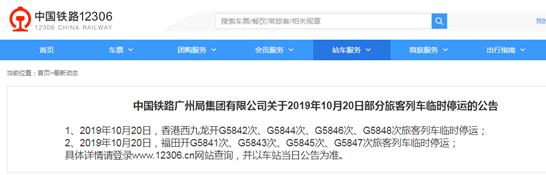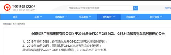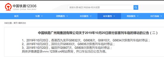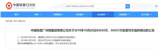 1、2019年10月20日,香港西九龙开G5632次、G5808次、G5810次、G5634次旅客列车临时停运;